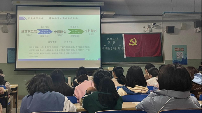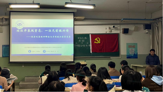 展示结束后,李荣川老师就“继往开来脱贫志,一往无前振兴情——脱贫攻坚精神解读与乡村振兴前景展望”的主题展开授课。李荣川老师讲解了“上下同心、尽锐出战、精准务实、开拓创新、攻坚克难、不负人民”的脱贫攻坚精神,并从促进产业兴旺、促进乡村生态宜居、促进乡村生活富裕等多个方面带领同学们展望乡村振兴的伟大前景。最后,李荣川老师强调,脱贫摘帽不是终点,而是广大中国人民新生活、新奋斗的起点。