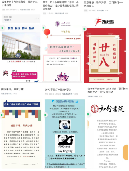 寒假以来,北航学院持续关注在校、返乡学生动态,各书院辅导员全覆盖摸排学生情况,开展习惯打卡、传统文化分享、假期生活分享、好书推荐等系列线上活动,丰富学生假期生活,营造温馨、充实、有意义的年味寒假。