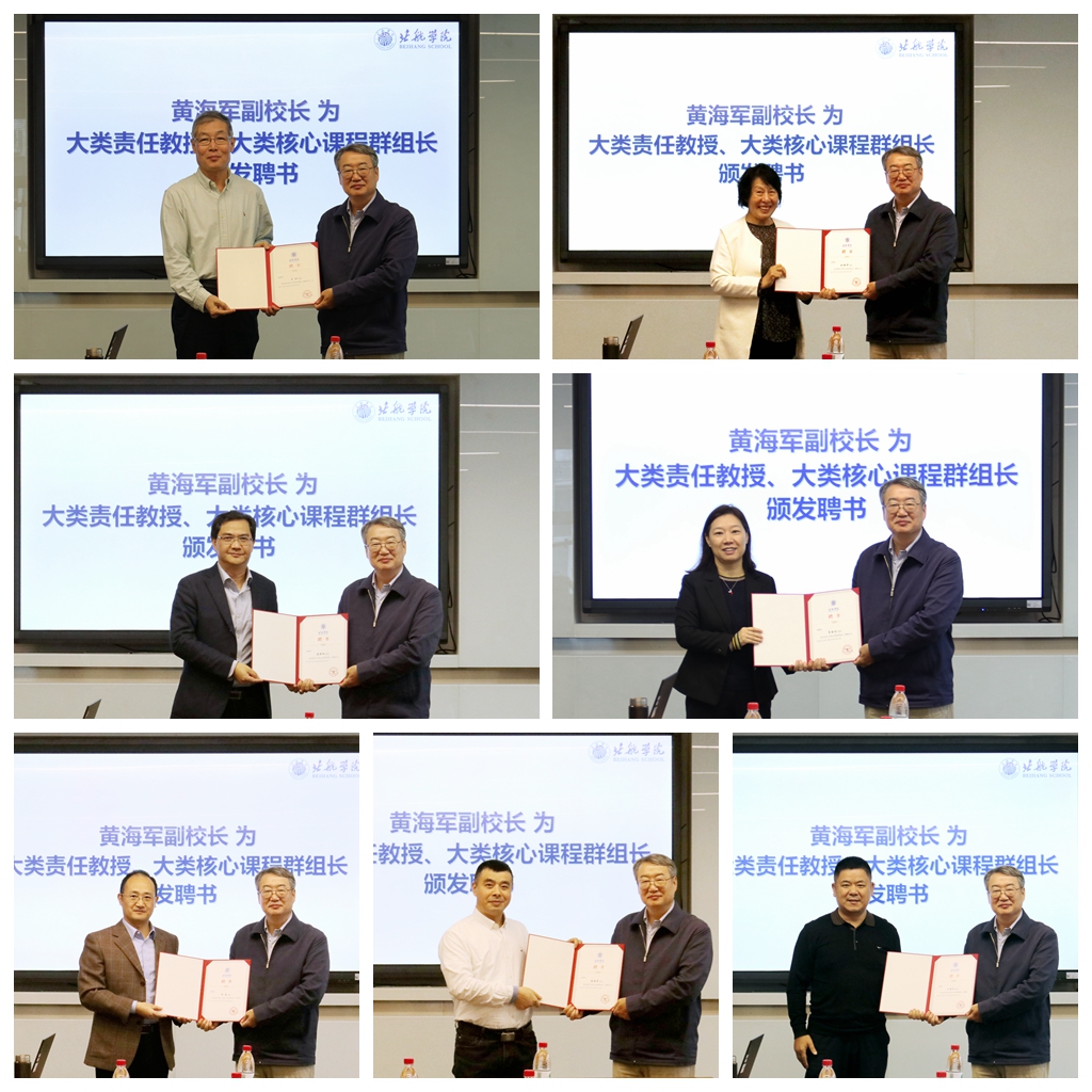 黄海军对大类责任教授、大类核心课程群组长对学校和学院工作的支持表示感谢。他表示,北航学院自2017年成立以来,进行大类招生、大类培养,各方面工作取得了阶段性成果。学校高度重视本科人才培养改革和学院的建设和发展,北航学院要持续深入推进大类培养及大类核心课程建设,深入研究大类培养与专业培养衔接协同机制,推进学校本科人才培养模式改革,为构建北航新时代高质量人才培养体系打好基础。随后,黄海军为大类责任教授、大类核心课程群组长颁发聘书。