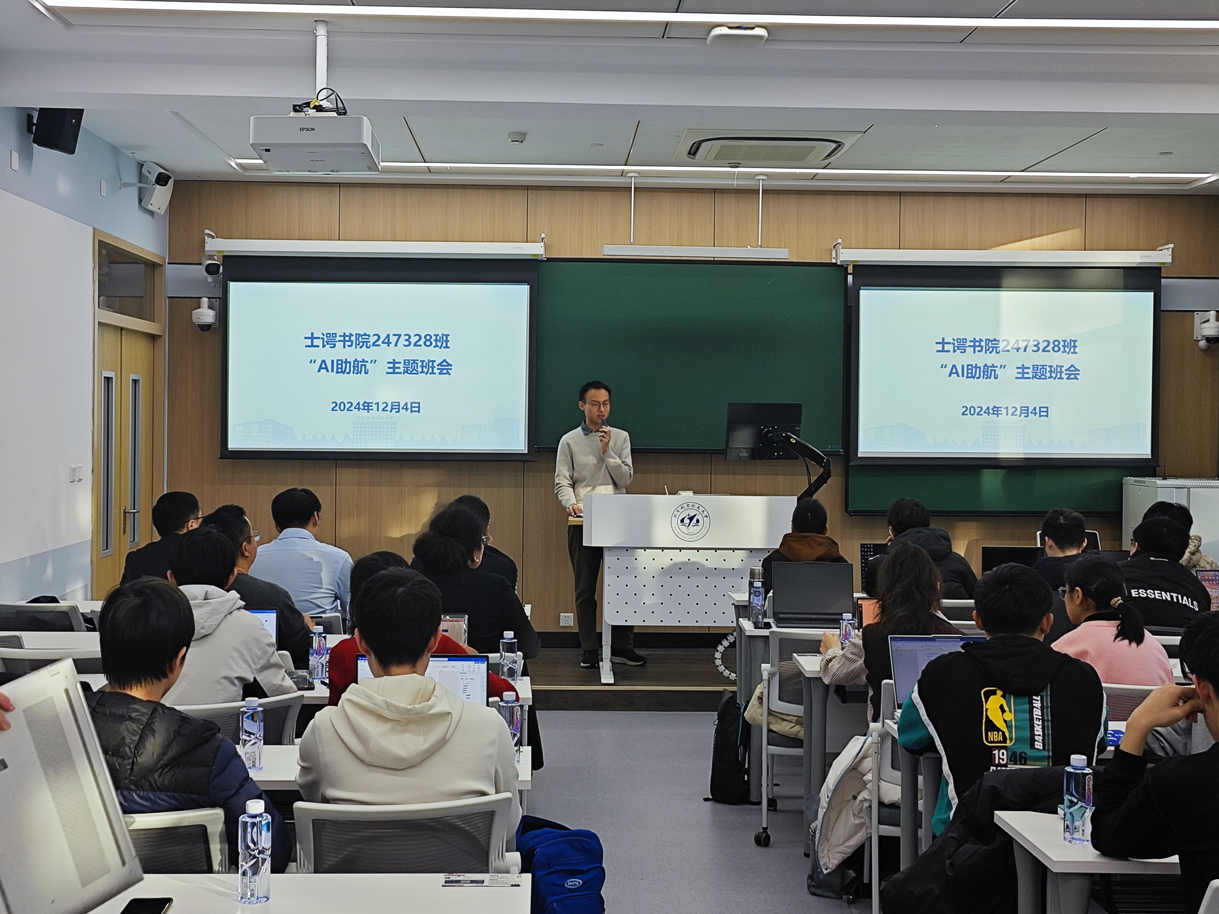 (通讯员 武在洽)12月4日上午,北航学院士谔书院247328班在学院路校区主楼321教室开展“AI助航”主题班会。副校长吕卫锋、北航学院党委书记、学生工作部部长宋晓东、北航学院院长刘虎、士谔书院执行院长丁丁、班主任陈兴乐、程序设计基础课程组教师李莹、AK宝典制作小组、程设课程组助教以及247328班全体同学共同参加了此次班会。