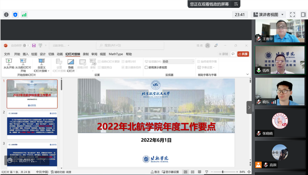 (通讯员 张芳芳 高原)为进一步凝心聚力,推动学院高质量发展,2022年6月1日,北航学院开展全院大会暨全面从严治党工作部署会,部署学院近期以及年度重点工作。学院党委书记宋晓东、院长钱政、其他领导班子成员等学院全体教职工共计110余人以线上方式参加会议。学院院长钱政结合学院近期工作情况部署了学院2022年年度工作要点。本年度学院将聚焦迎接学习贯彻党的二十大这条贯穿全年工作的主线,持续落实学校“能力建设年”要求...